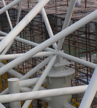 螺栓球網(wǎng)架主要在加工廠(chǎng)內(nèi)制作,焊縫處理基本在加工廠(chǎng)內(nèi),處理完畢,網(wǎng)架設(shè)計(jì)桿件長(zhǎng)度容易控制,到達(dá)施工現(xiàn)場(chǎng)直接拼裝就可以,適用于全部結(jié)構(gòu),特別是造型結(jié)構(gòu),能夠保證施工精度,保證結(jié)構(gòu)造型的一致性。施工方法較多,施工費(fèi)用及措施費(fèi)用較低,施工進(jìn)度較快。
